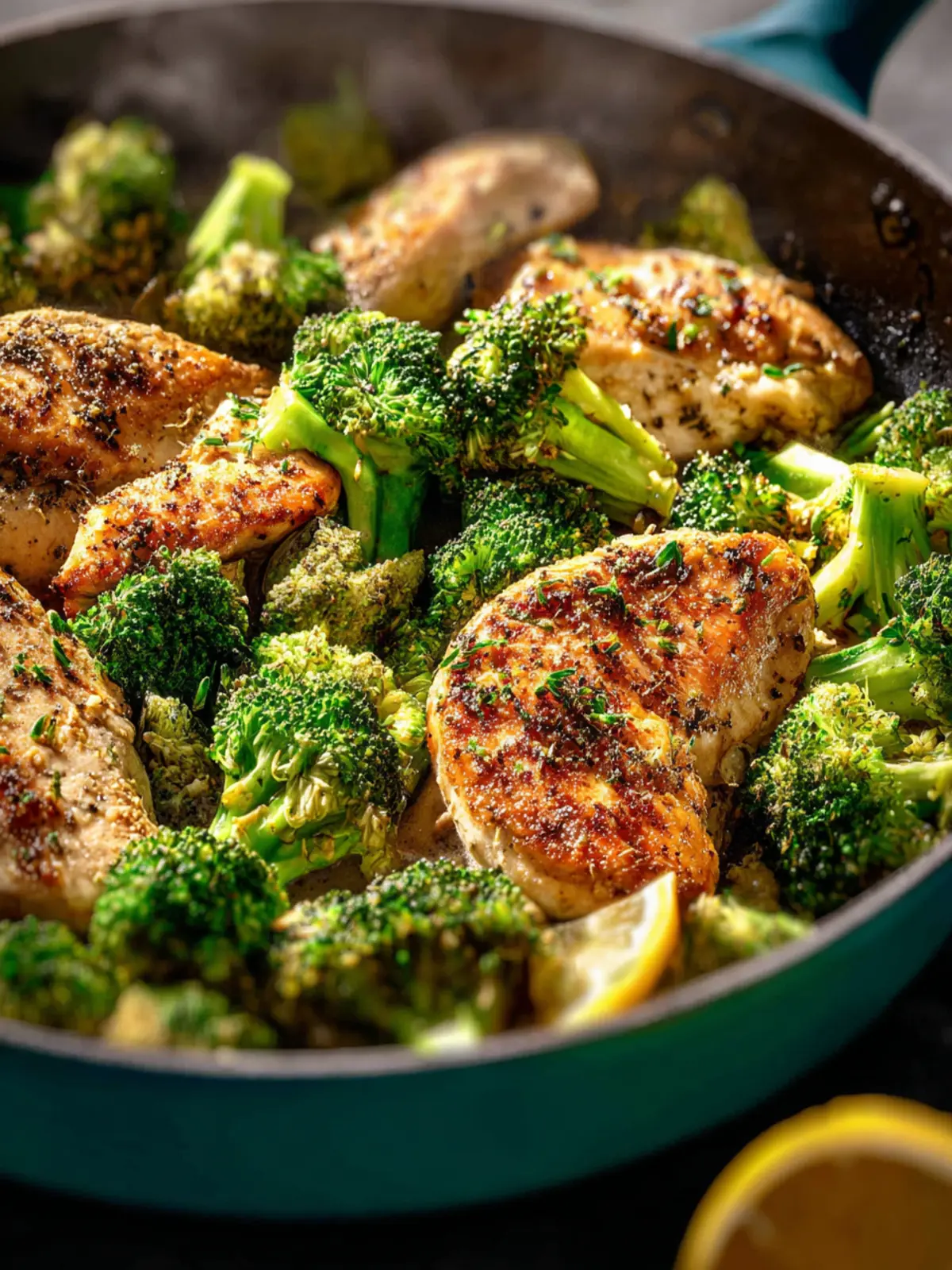 A delicious dish featuring tender chicken breasts sautéed with broccoli and garlic, finished with lemon juice and parmesan cheese.