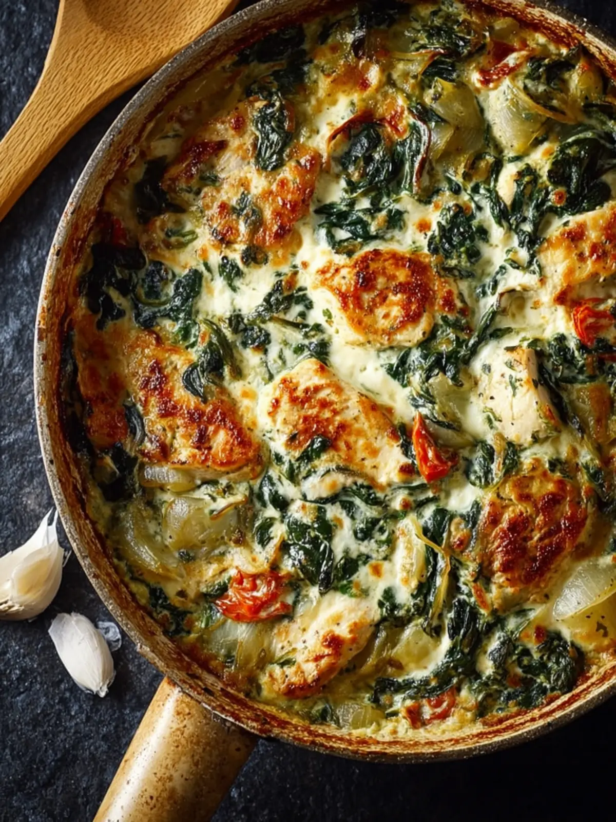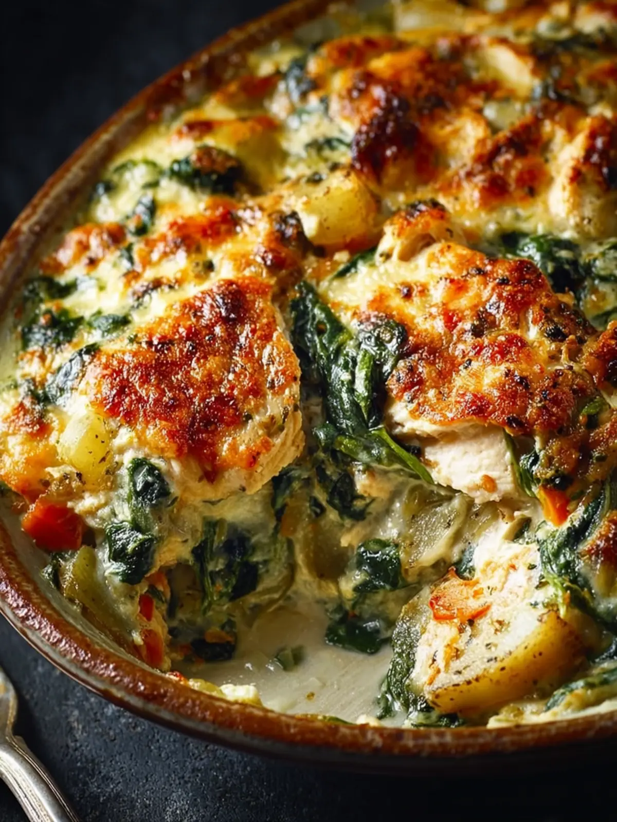 A delicious creamy casserole featuring chicken, spinach, and cheese.