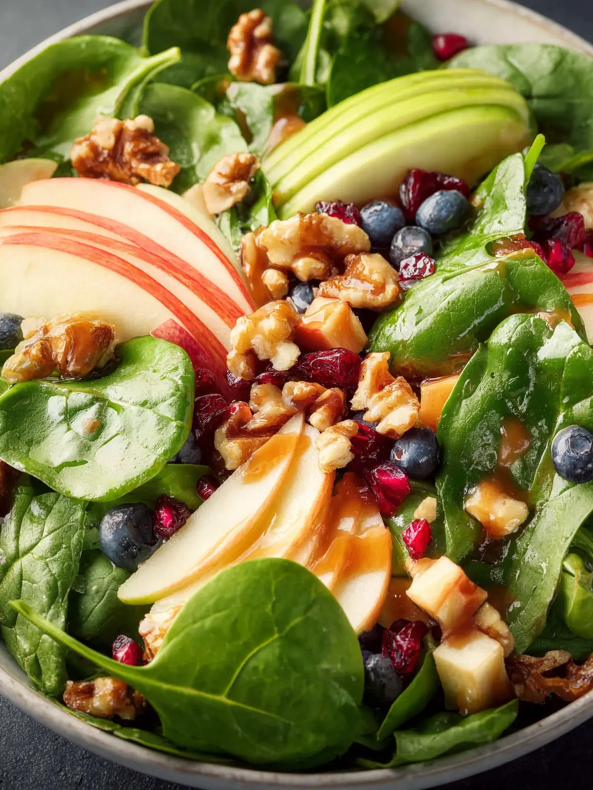• Citrus Vinaigrette: A light lemon or orange vinaigrette brightens the salad, enhancing the freshness of the spinach and apples.