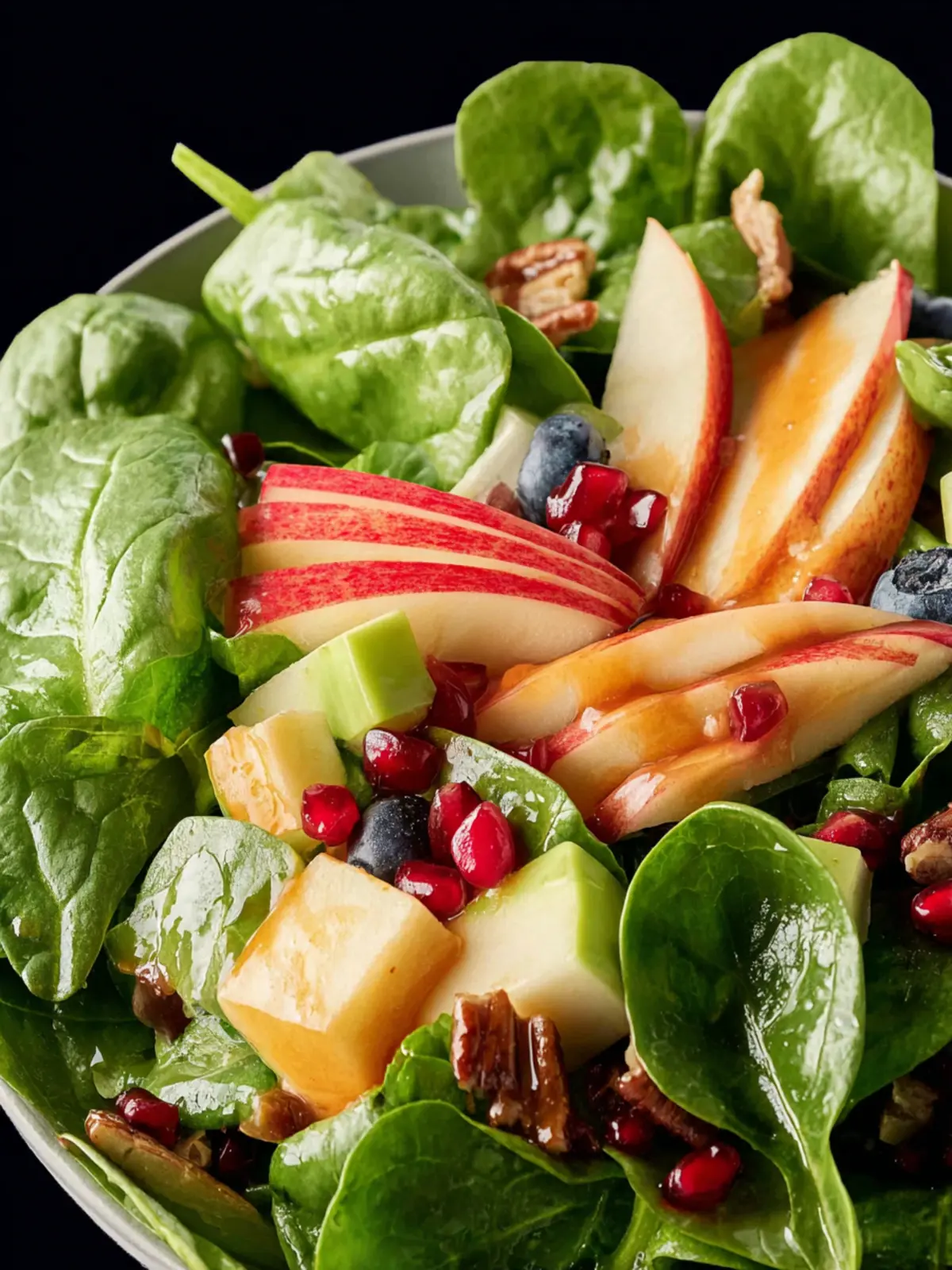 1. Place the spinach, apple slices, blueberries, pomegranate seeds, celery, and walnuts in a large bowl.