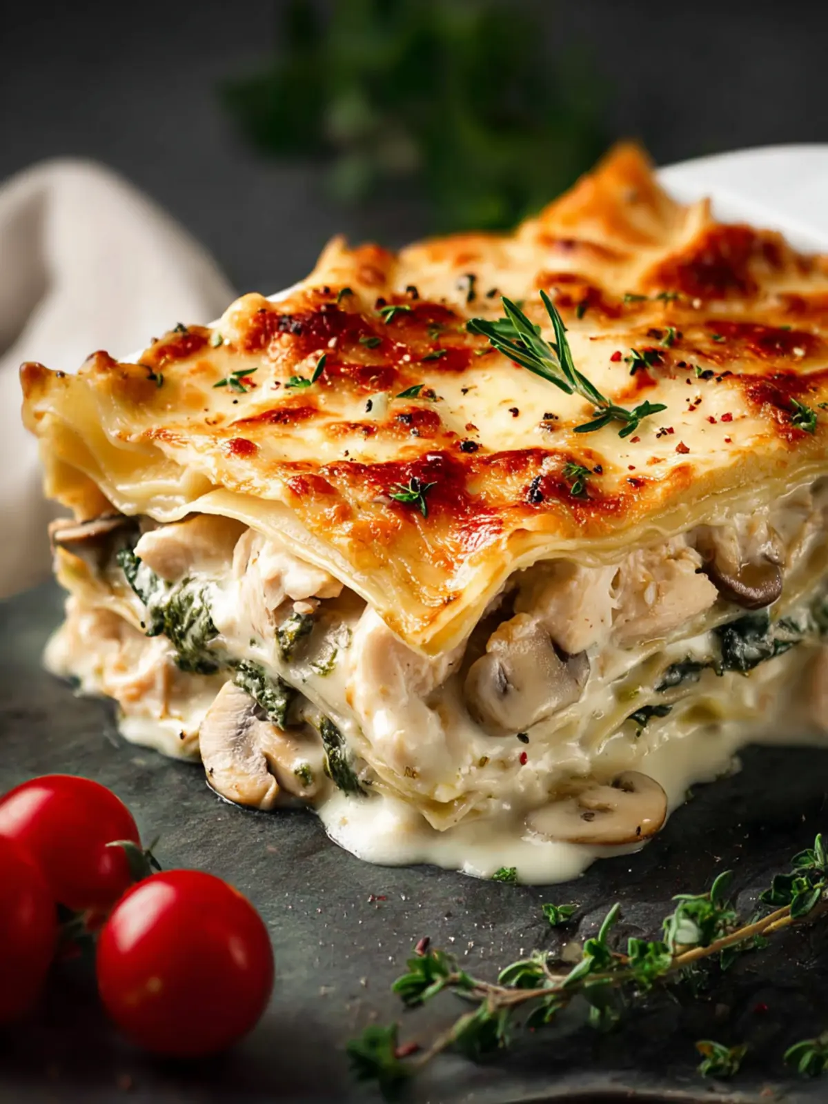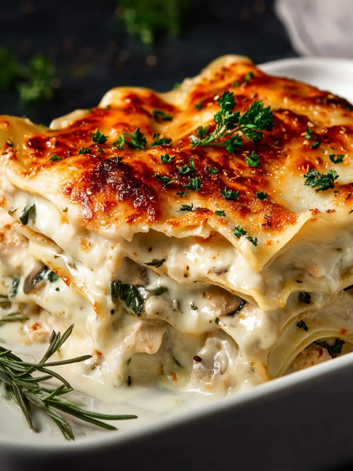 A creamy and delicious lasagna filled with chicken, mushrooms, and ricotta, perfect for a comforting meal.