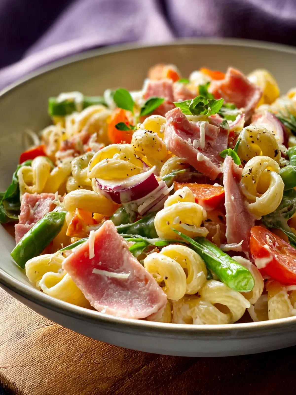 A delicious pasta salad with ham, asparagus, and a creamy dressing.