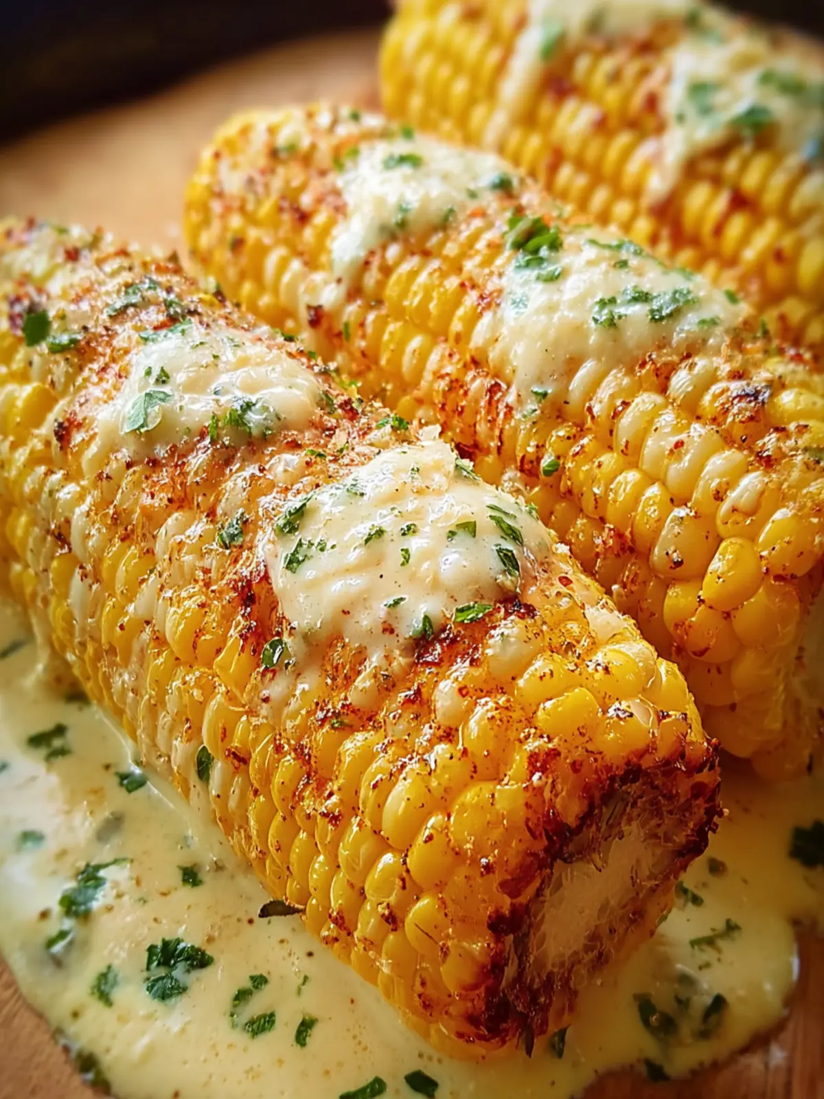 - Combine Corn and Sauce: Once the corn is grilled, remove it from the grill and place it on a serving platter. Drizzle the creamy Parmesan sauce generously over the hot corn.