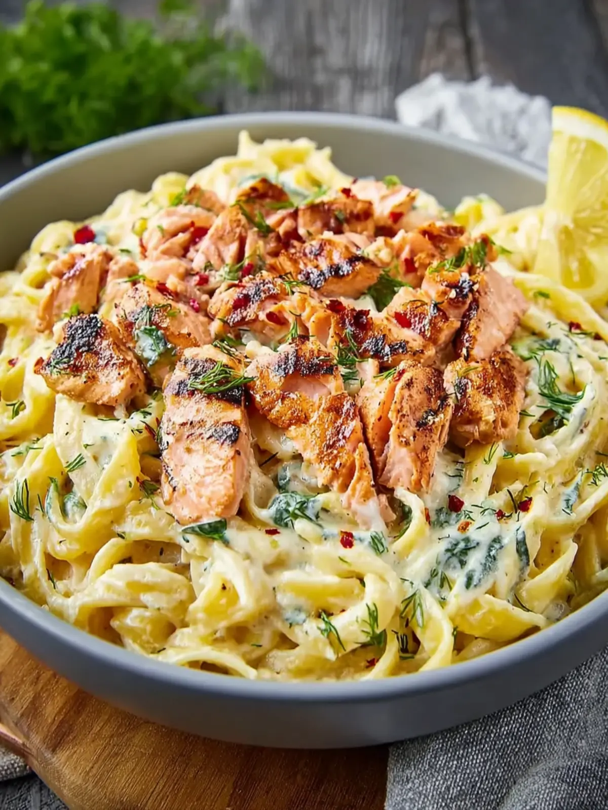 A rich and creamy pasta dish featuring flaked salmon and a delightful blend of flavors.