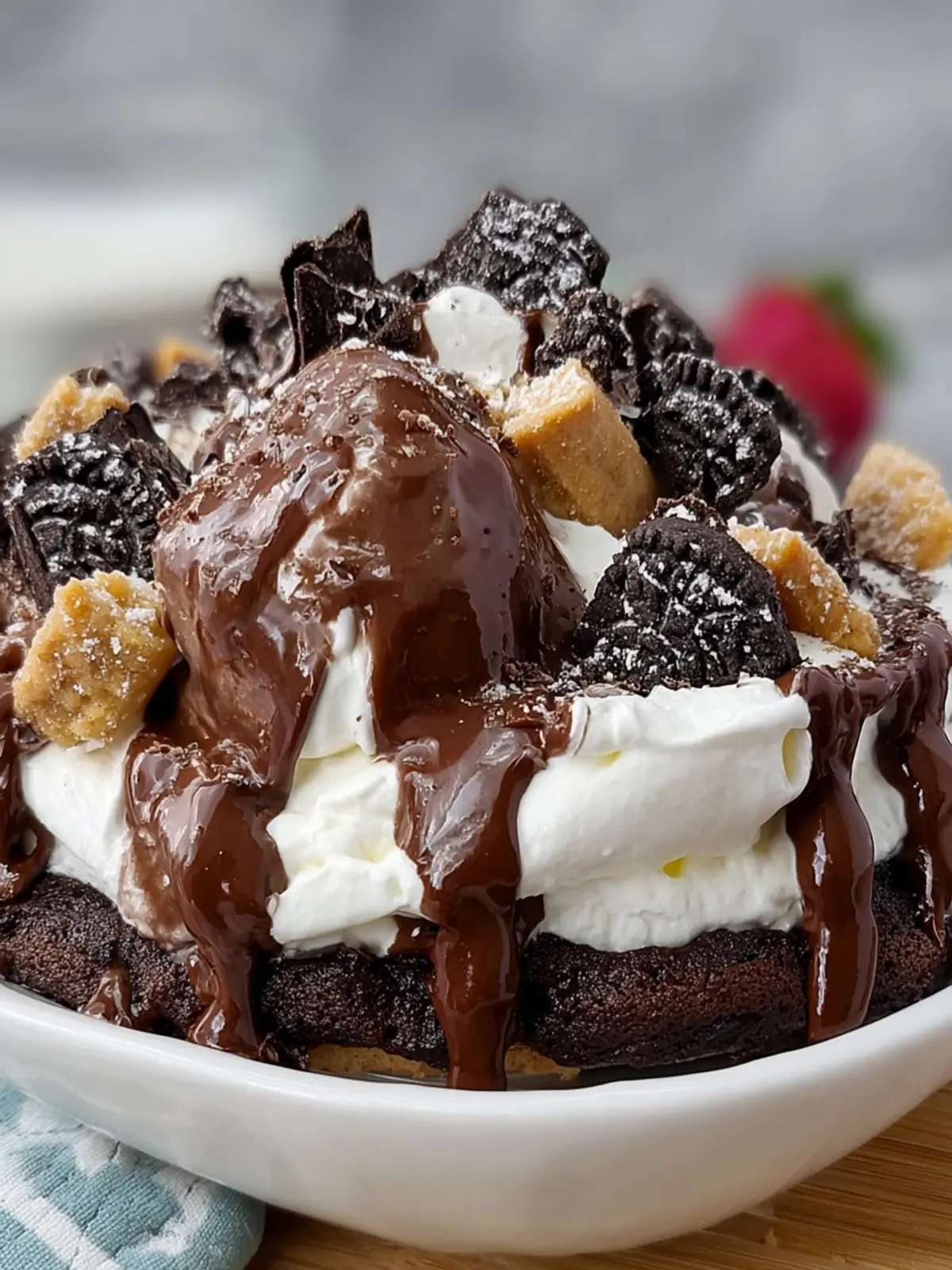 A rich and layered dessert featuring chocolate pudding, crushed cookies, and whipped cream.