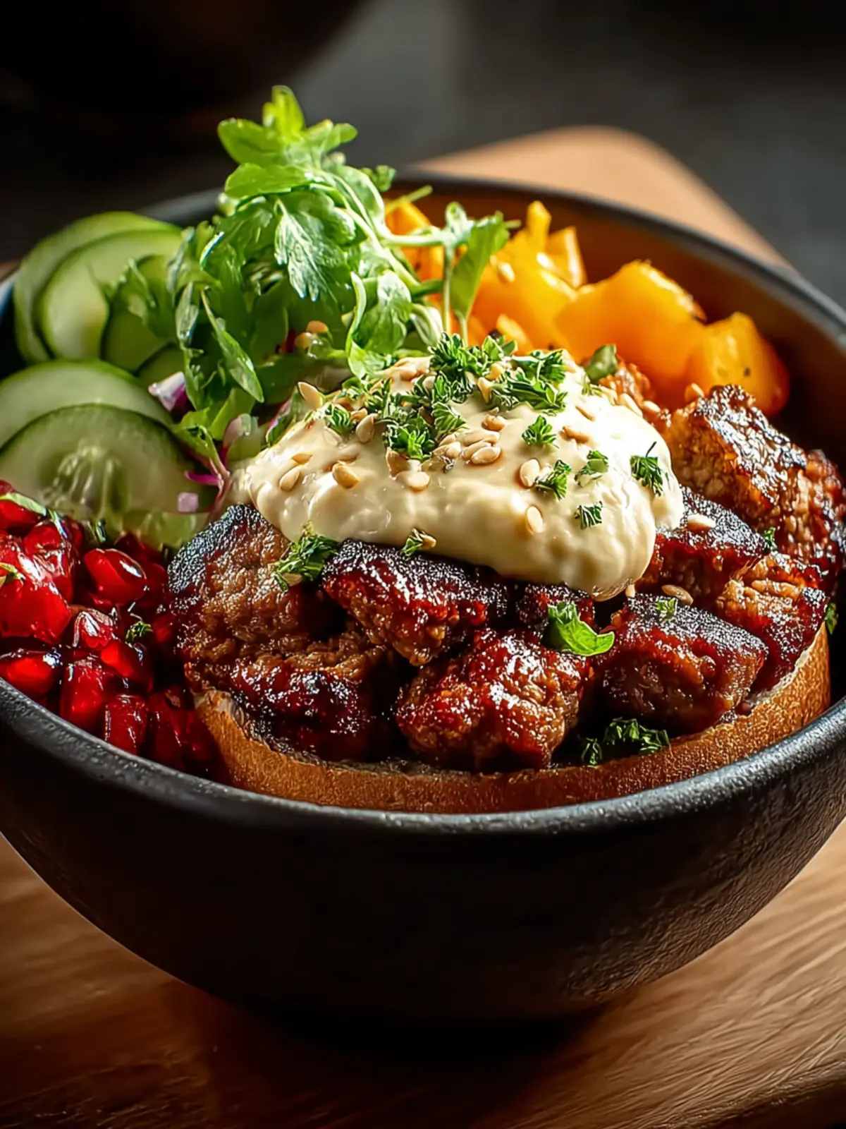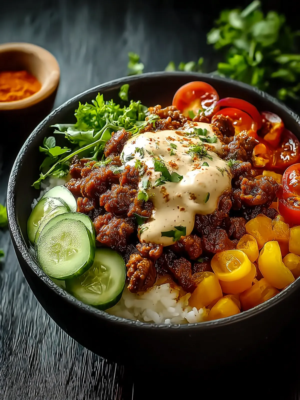 If you’re craving a kick, this variation is for you! Incorporate black beans, corn, and diced bell peppers to your base. Season the beef with taco spice and top with avocado slices, freshly chopped cilantro, and a squeeze of lime. A zesty chipotle mayo brings everything together beautifully.