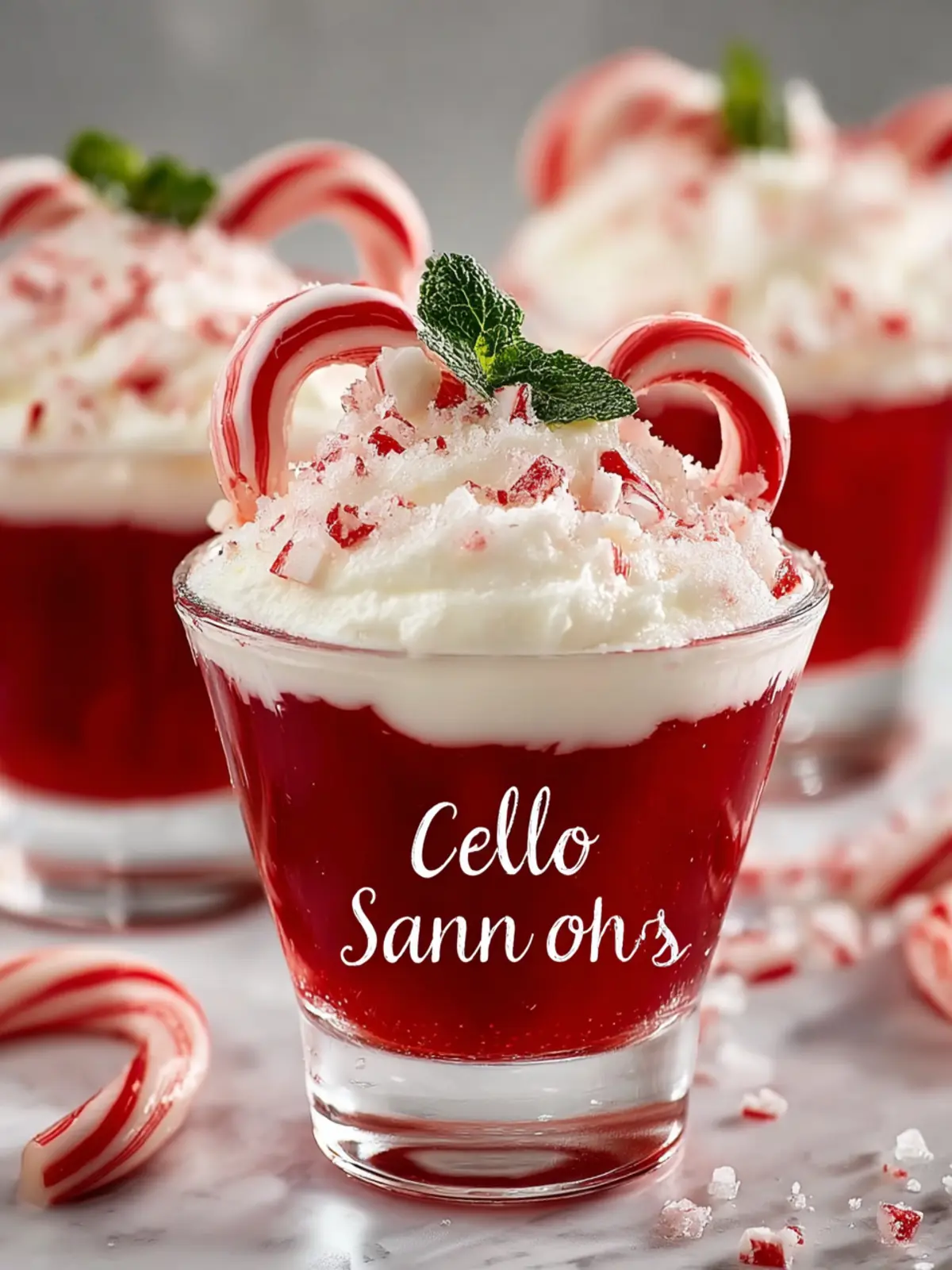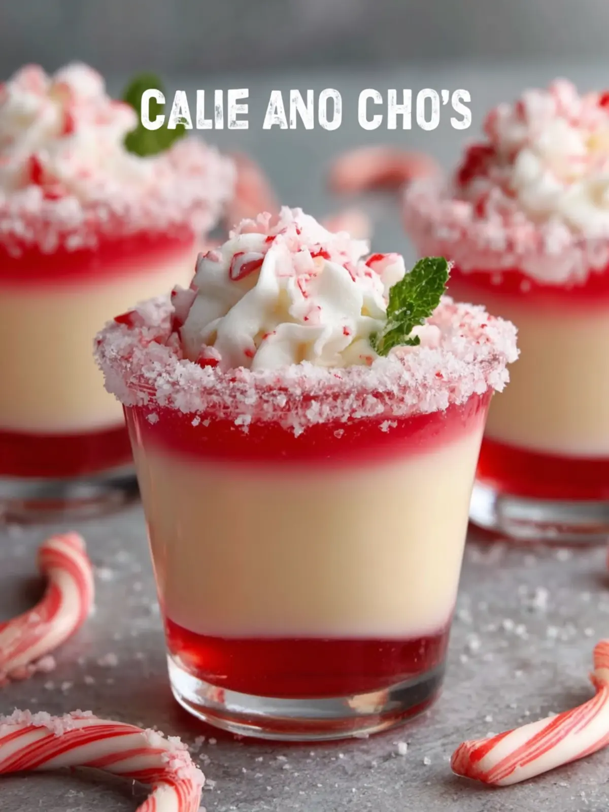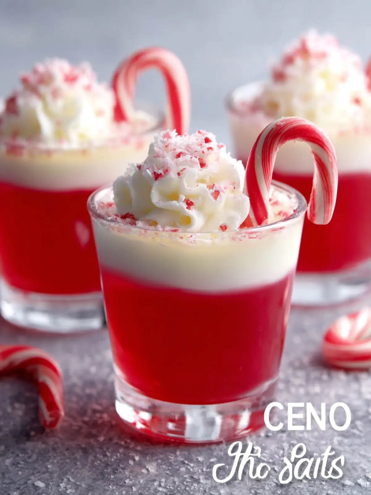 - GARNISH AND SERVE: Once fully set, hook a mini candy cane onto the edge of each shot glass. Just before serving, optionally pipe a swirl of whipped cream on top or sprinkle with crushed candy cane pieces for extra holiday flair.