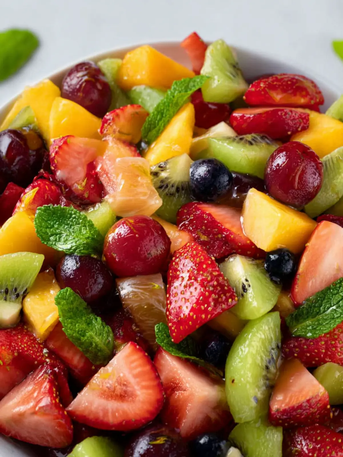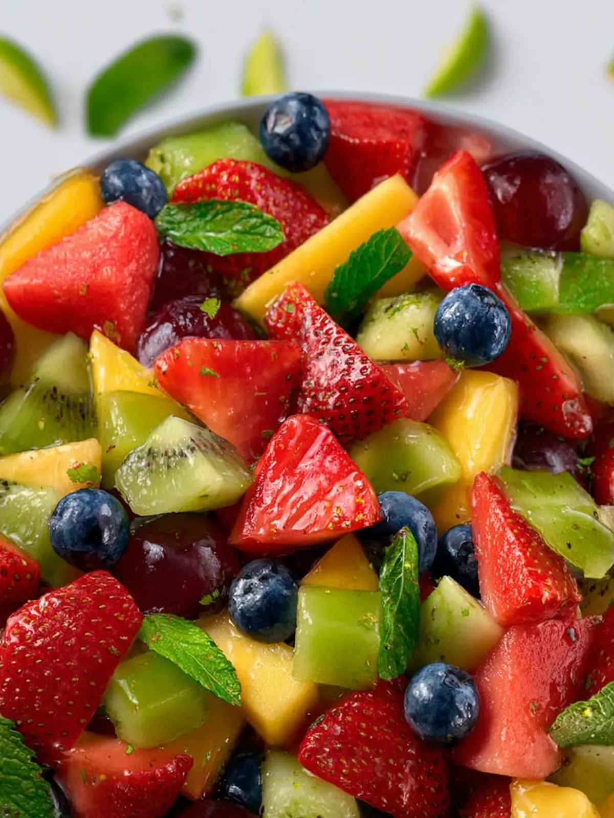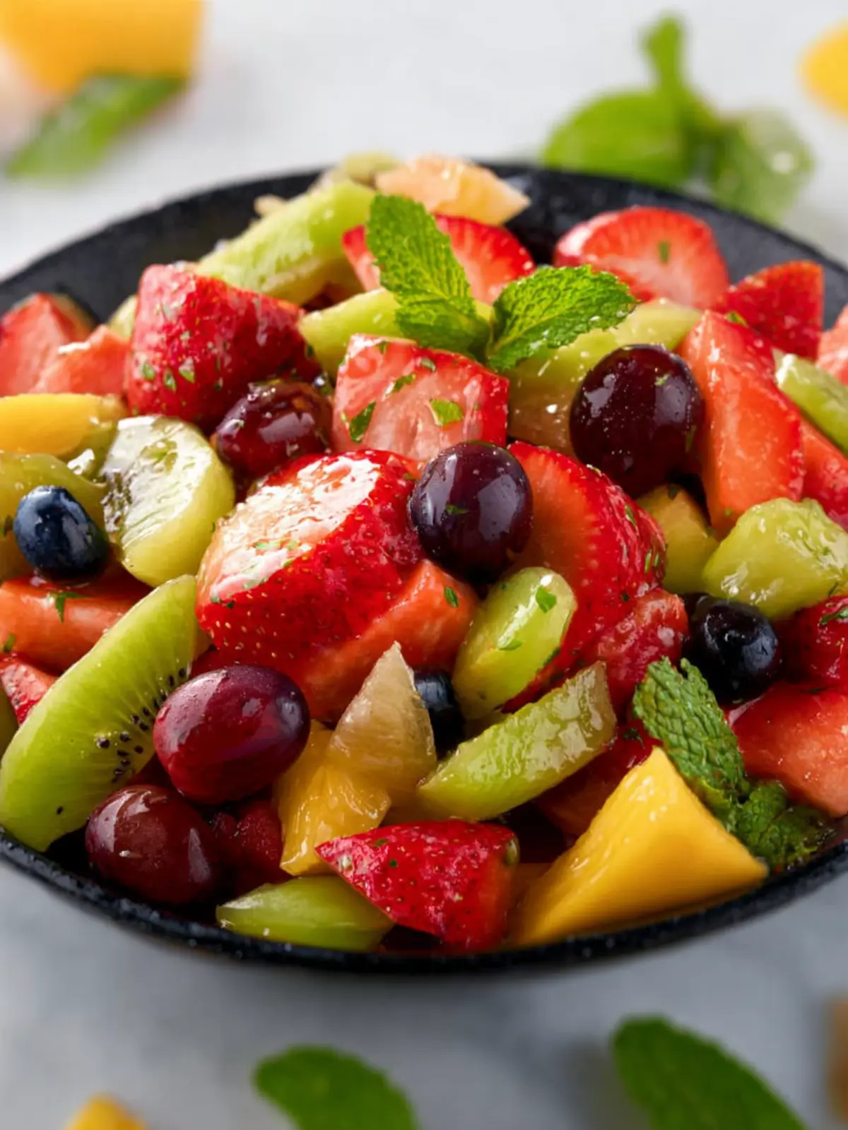 Mint: A handful of fresh mint leaves adds a refreshing touch. The coolness of mint elevates the entire fruit salad, making it extra delightful on a warm day.