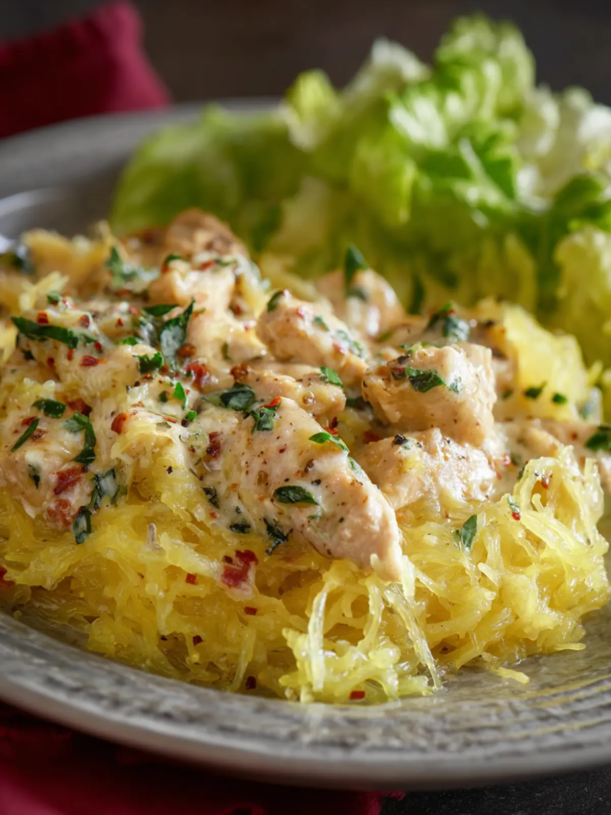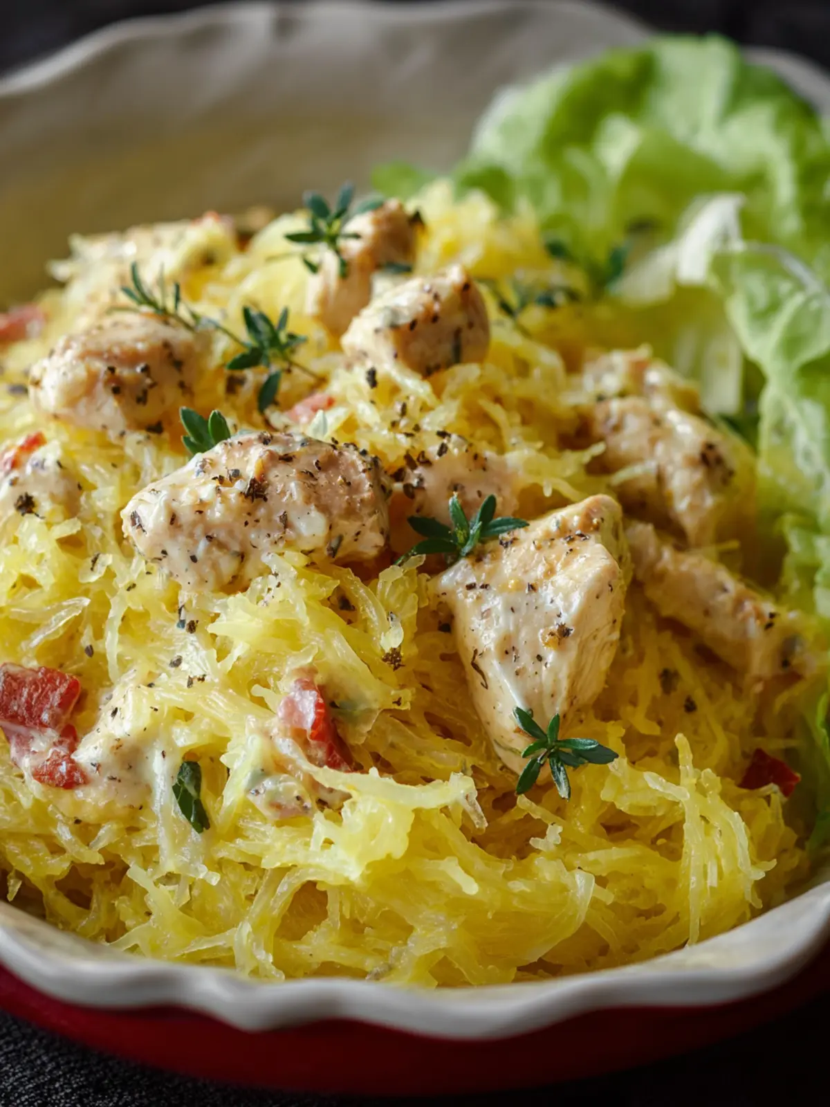 A delicious and creamy spaghetti squash dish with shredded chicken, perfect for a healthy meal.
