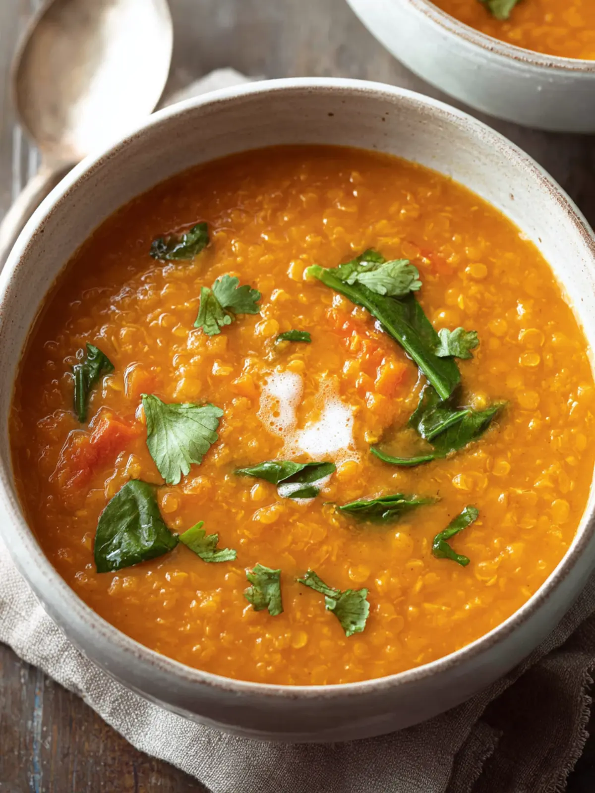 This creamy red lentil soup is packed with vegetables and spices, perfect for a warming meal.