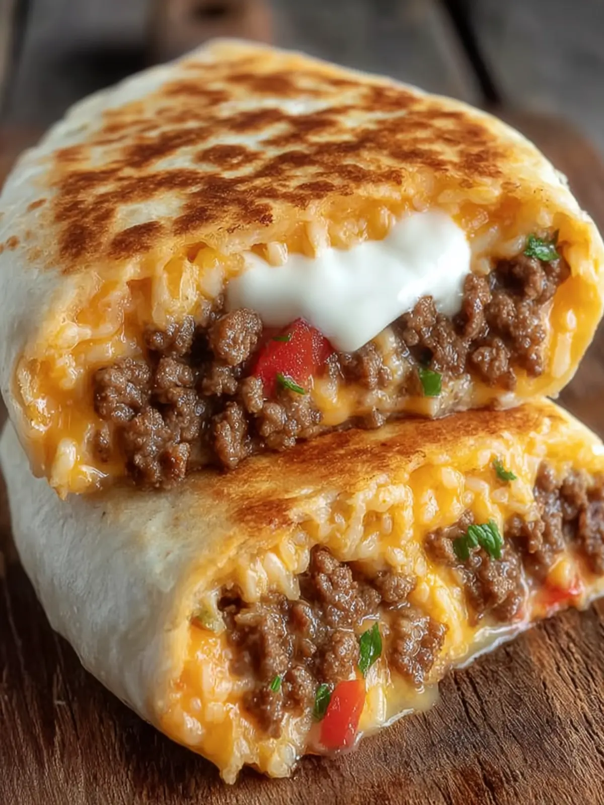 A delicious and cheesy quesadilla filled with savory beef, rice, and melted cheddar.