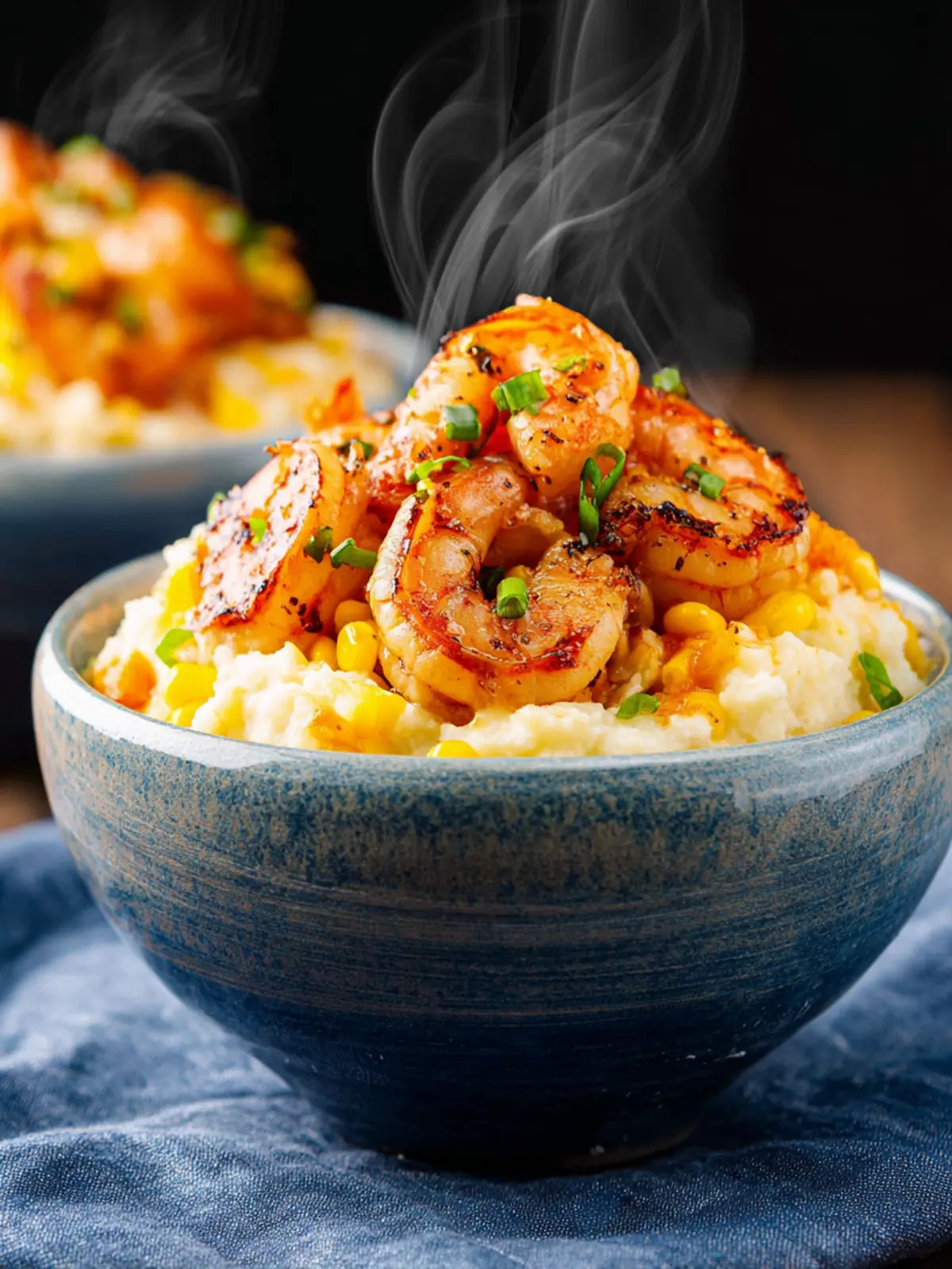 A delicious recipe combining creamy mashed creamer potatoes topped with spicy shrimp and charred corn.