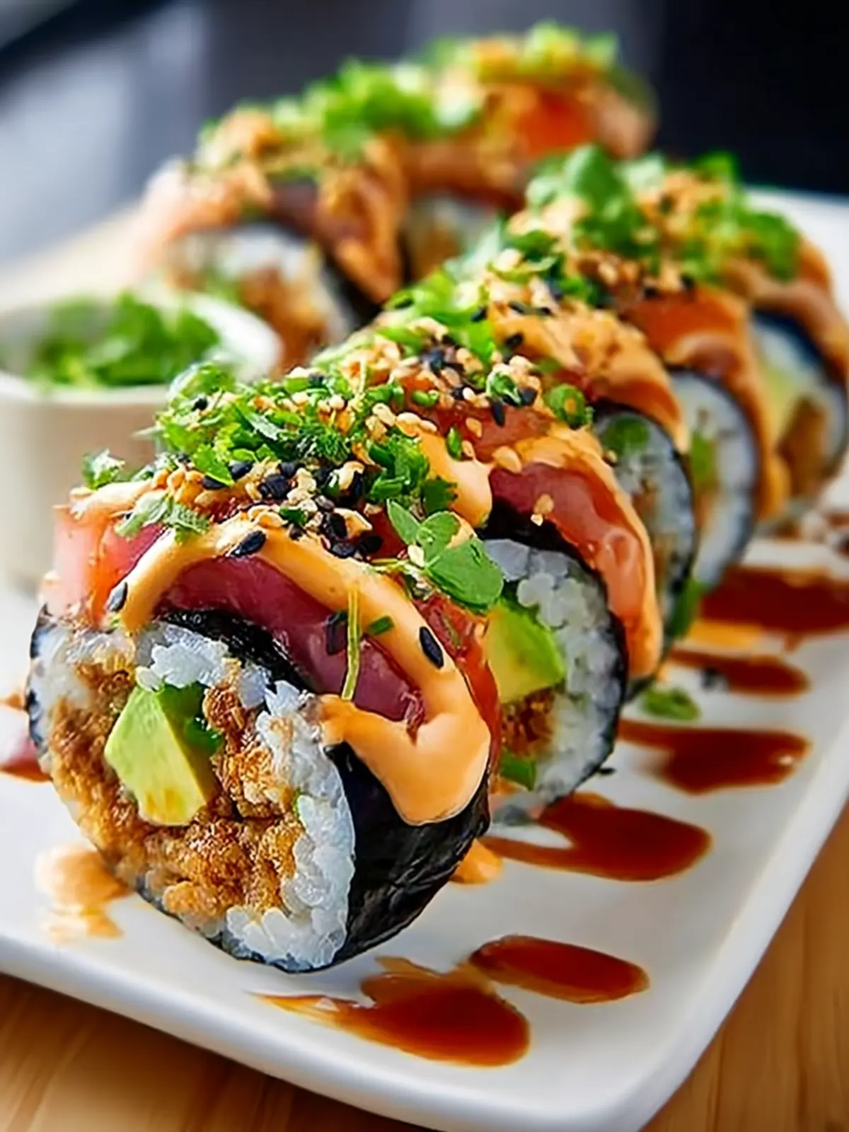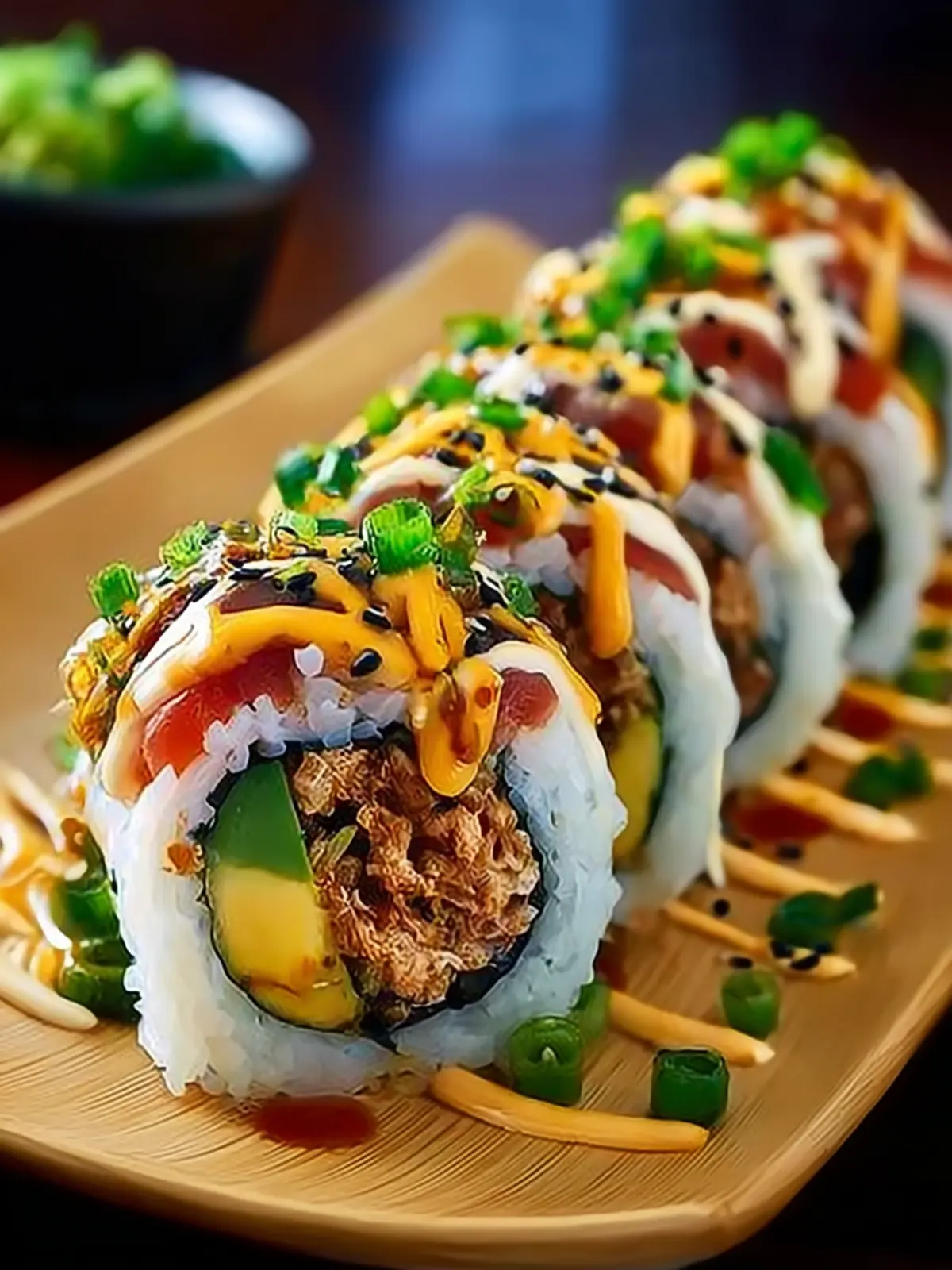 - Colorful Ingredients: With ingredients like spicy tuna or seasoned ground beef wrapped in sushi rice and vibrant veggies, each slice bursts with color and flavor.